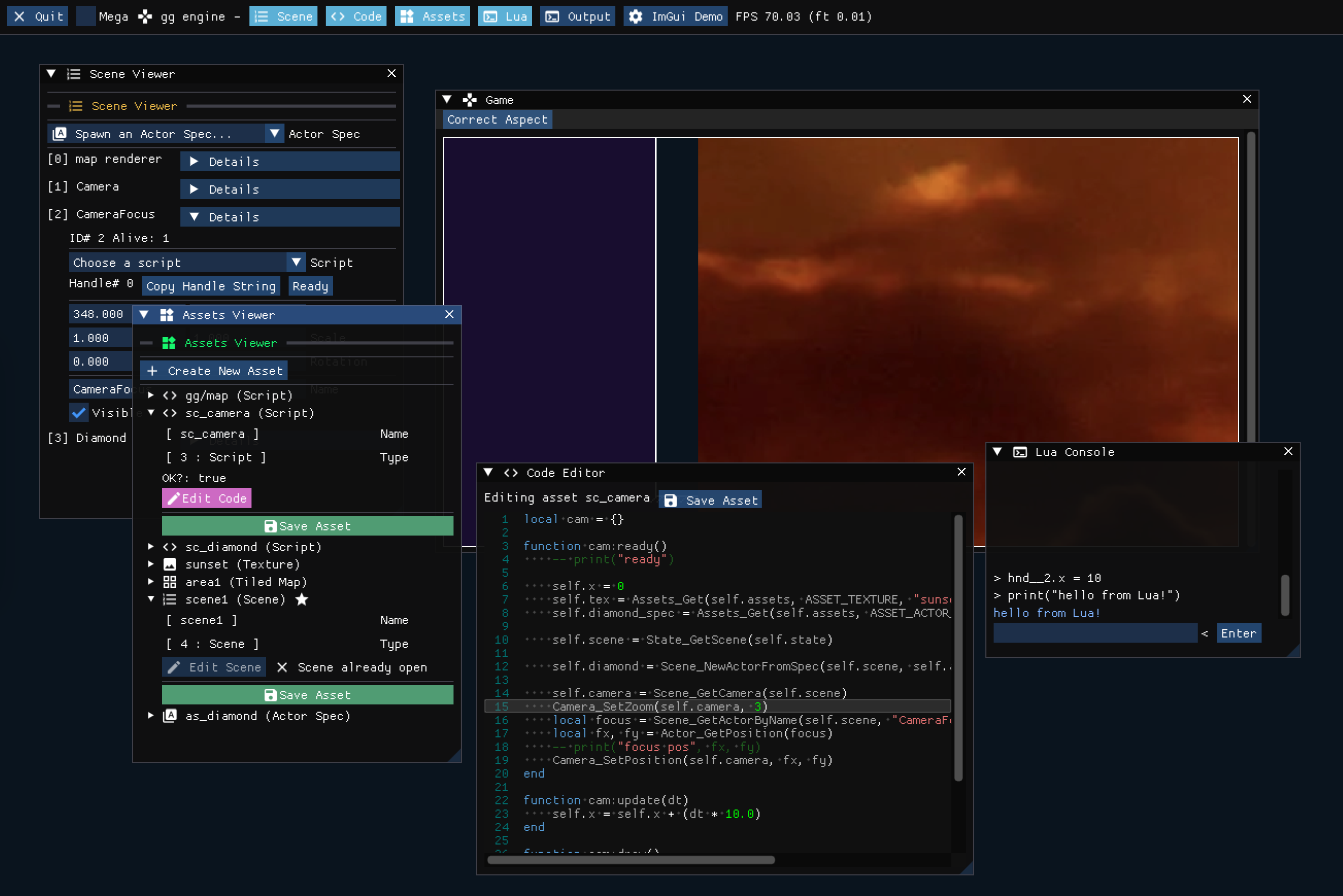 A 2D game engine written in pure C that supports Lua scripting, tilemap loading and rendering, and a script and level editor.