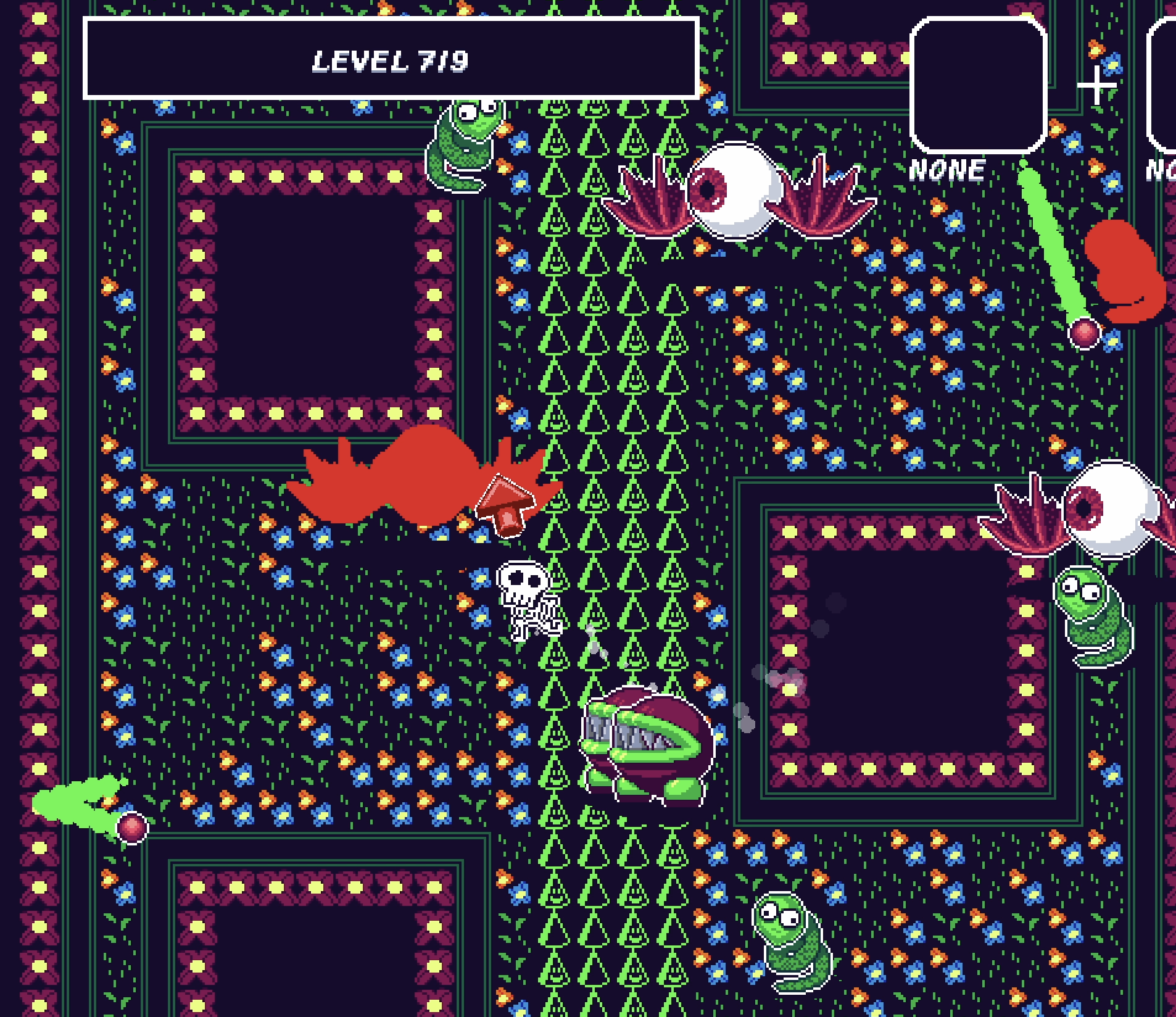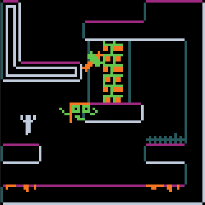 Keeping the art super limited was a big help for this game. I kept each tile (including the player) to 8x8, and there’s only 6 colors in the game total. I think these limitations made it much easier to go from idea to implementation, and probably helped with the longevity of the project. I would not want to do this again without someone to collaborate with.