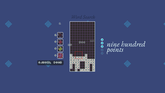 Short Postmortem: I put this little combo of Tetris and word-searches together in 48 hours for a game jam at my college, and I’m super pleased with how it turned out. It’s the first time I scoped for an idea fully and then actually entirely completed the scope within the time frame I had, with multiple hours left over for 3D graphics and excessive polish. I personally have a ton of fun playing this one, and I hope you enjoy it too if you get a chance to play!